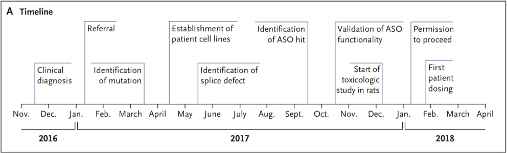 En 2019 se publicó la historia del Milasen, tratamiento llamado así en honor de Mila, niña afectada con el síndrome de Batten. El procedimiento fue muy rápido por el avance de la enfermedad y obtener el permiso de las autoridades en EEUU para su uso.